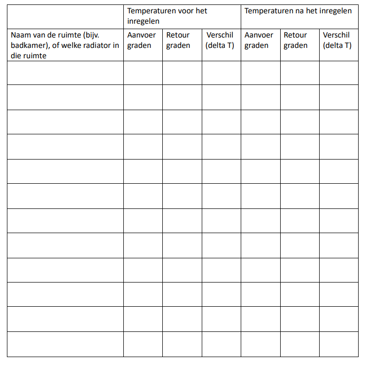 Houd de temperaturen die je gaat meten bij met dit formulier. Je kunt het bestand uitprinten in invullen tijdens het meten. Dat helpt jou met inzicht krijgen in alle radiatoren. Vanaf het nieuwe jaar gaan we je ook hulp bieden met het afstellen van de radiatoren. Dan is het handig om dit formulier bij de hand te hebben. Bewaar dit formulier na het invullen dus goed, of maak een foto. Zo ziet het formulier eruit: