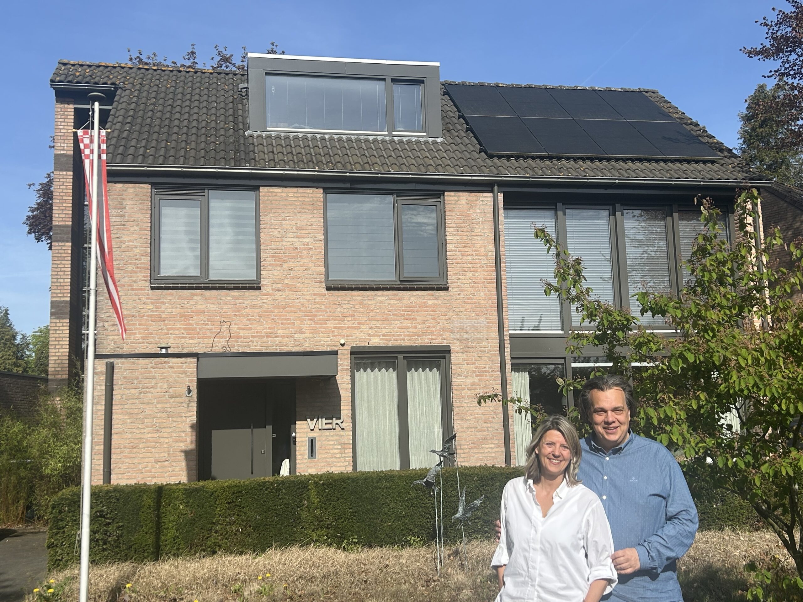 Een aantal jaar geleden plaatste het stel 17 zonnepanelen (oost-west) en werd de gevel aan de achterzijde voorzien van isolatieglas. Ook de voordeur werd daarbij vernieuwd. Sinds de komst van de zonnepanelen maken Gijs en Nicole er samen een sport van om op een zo gunstig mogelijk moment te wassen en afwassen. Verspilling voorkomen is hen met de paplepel ingegoten.